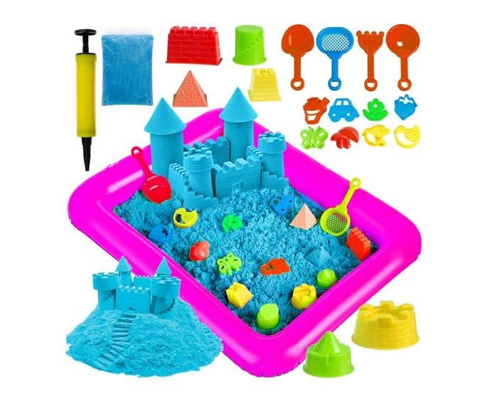 Setul de nisip kinetic include si o tavita de nisip gonflabila.